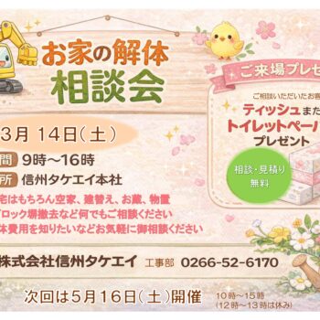 株式会社信州タケエイの解体事業では、住宅やマンション、店舗、工場などの建物解体工事を行い、安全かつ迅速に施工します。法令遵守と周辺環境への配慮を重視し、解体工事の流れには見積り、契約、書類提出、近隣挨拶、工事開始、廃棄物搬出、工事完了、再度の近隣挨拶が含まれます。長野県全域および近隣県でサービスを提供し、地域社会との信頼関係を築きながら、20年以上の実績を持っています。
