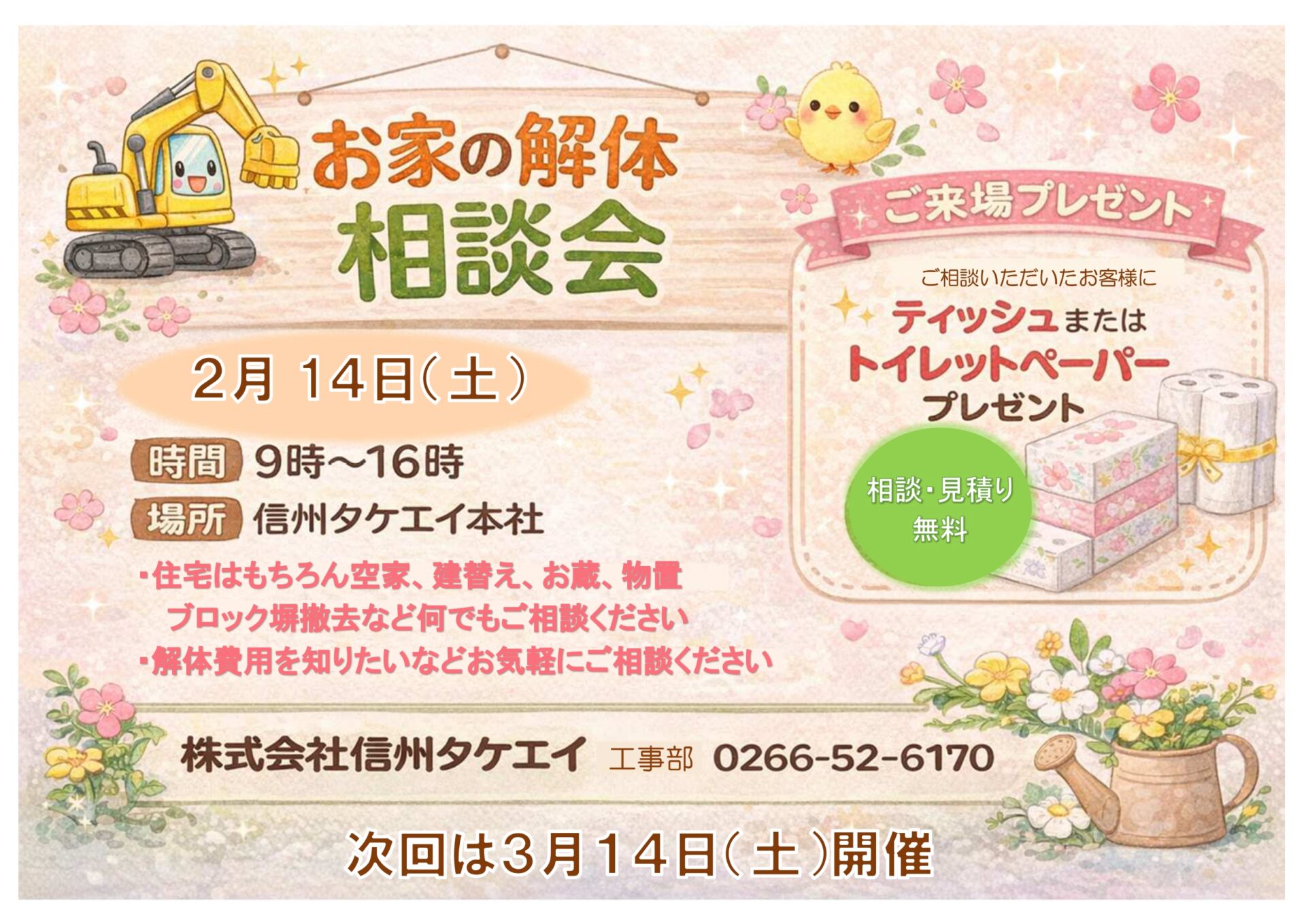 2月14日(土)に信州タケエイ本社にて、お家の解体相談会を開催いたします。